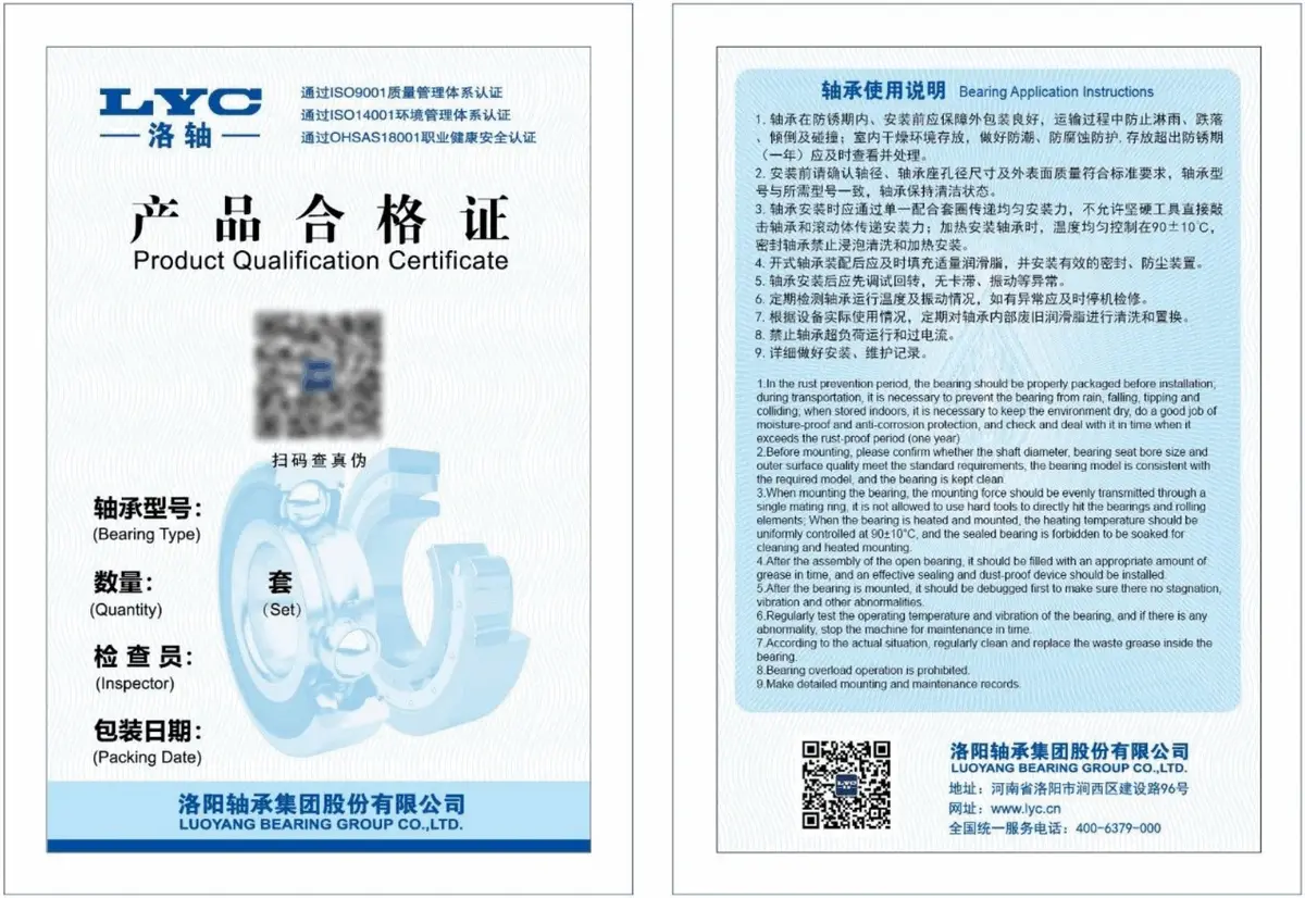 我司2024年初更名为洛阳轴承集团股份有限公司,根据业务需要及市场反馈等多方因素考虑,从即日起我司新出厂通用产品的合格证样式将进行改版,主要变更方面为去掉防伪码及序列号的显示,增加防伪二维码,检查员及日期印章变为直接打印的形式等,改版后新版合格证防伪可以使用手机直接扫描二维码按照系统提示进行,旧版库存产品的合格证防伪查询方式不变,新旧两种合格证将持续并行直至旧版产品消耗完毕。